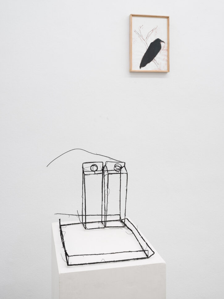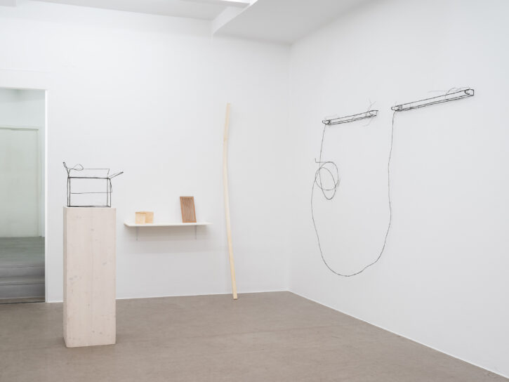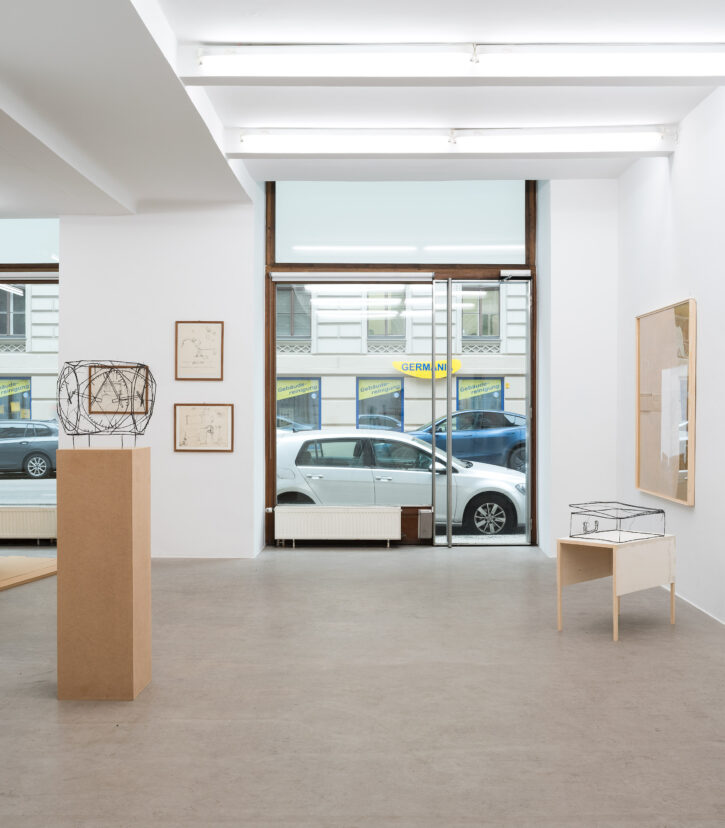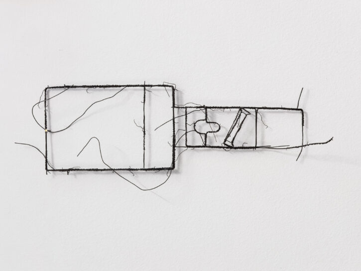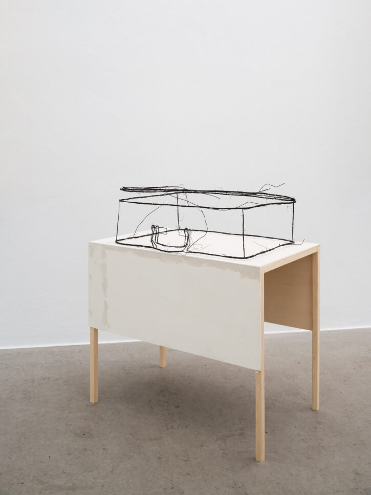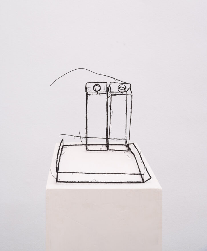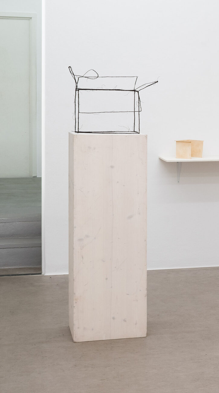 Die ersten Drahtskulpturen sind im Jahr 2000 entstanden. Ich nenne sie dreidimensionale Zeichnungen. Zum Beispiel ein Reisekoffer, eine Schuhschachtel, ein Waschbecken, ein Plattenspieler, eine Wiener Würfeluhr. Draht hat weniger Körper als Karton. Was in der Skulptur bleibt, ist der Strich der Zeichnung.