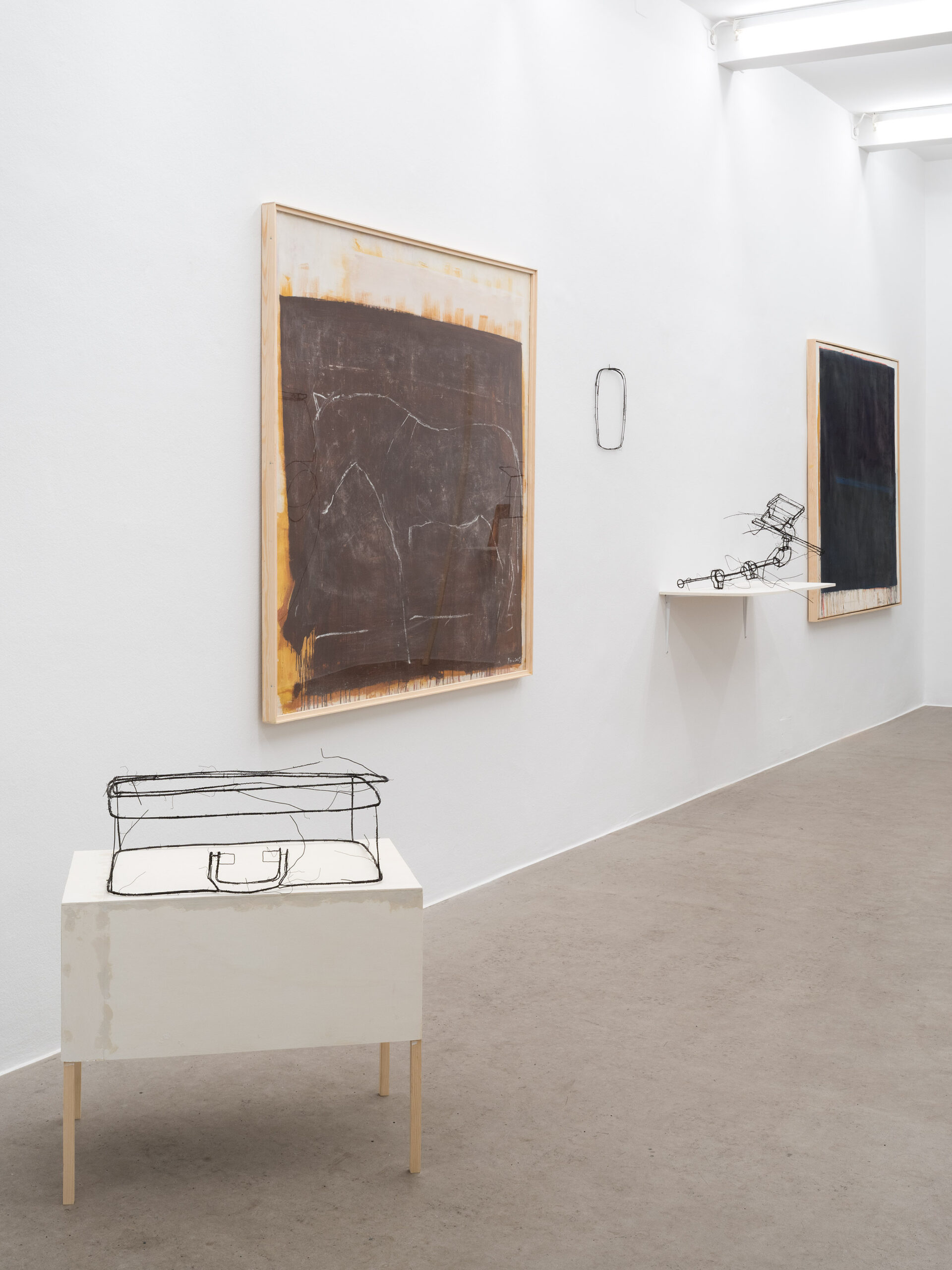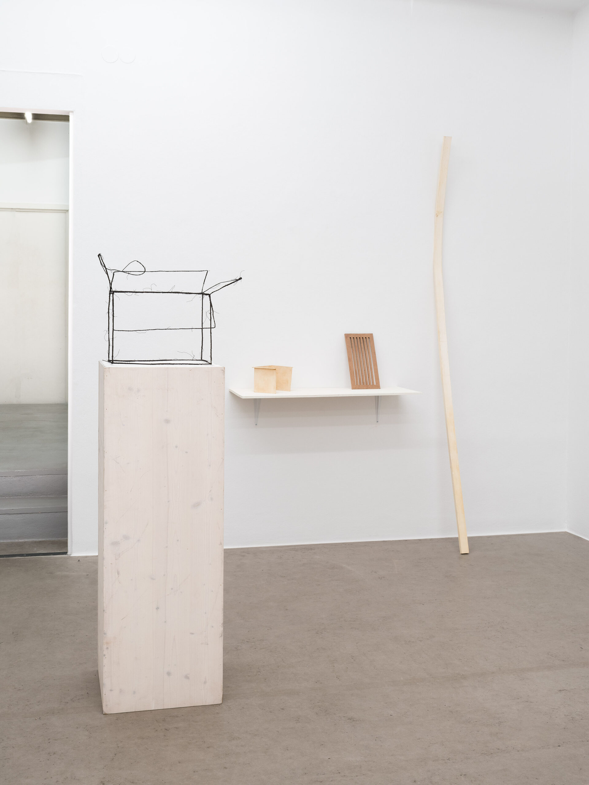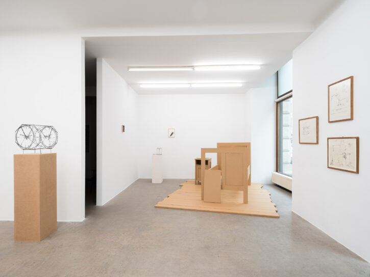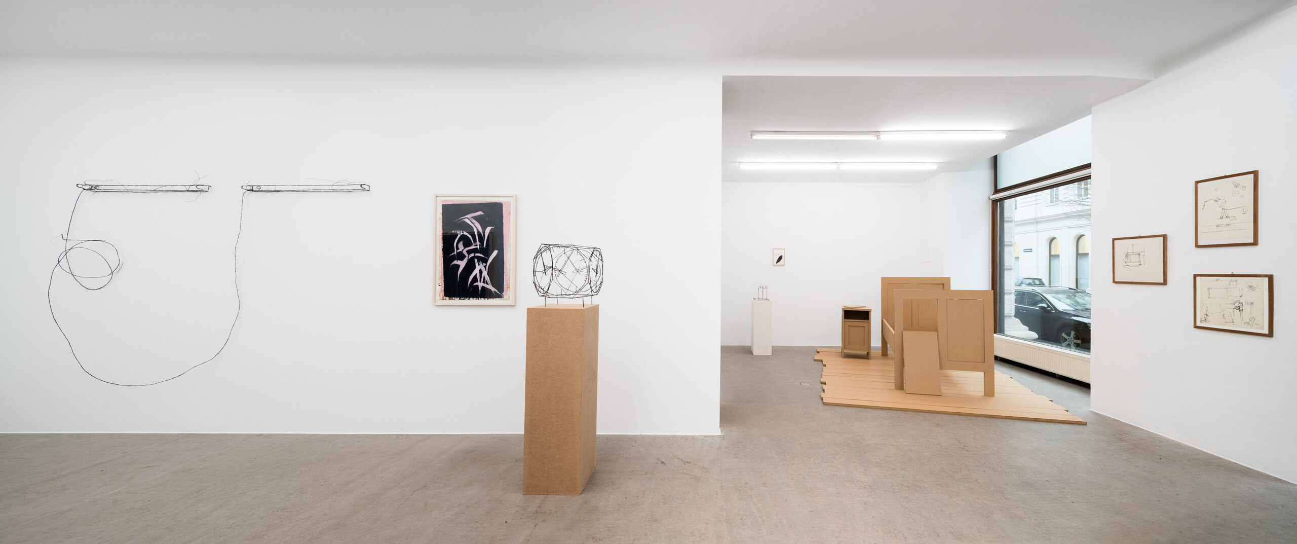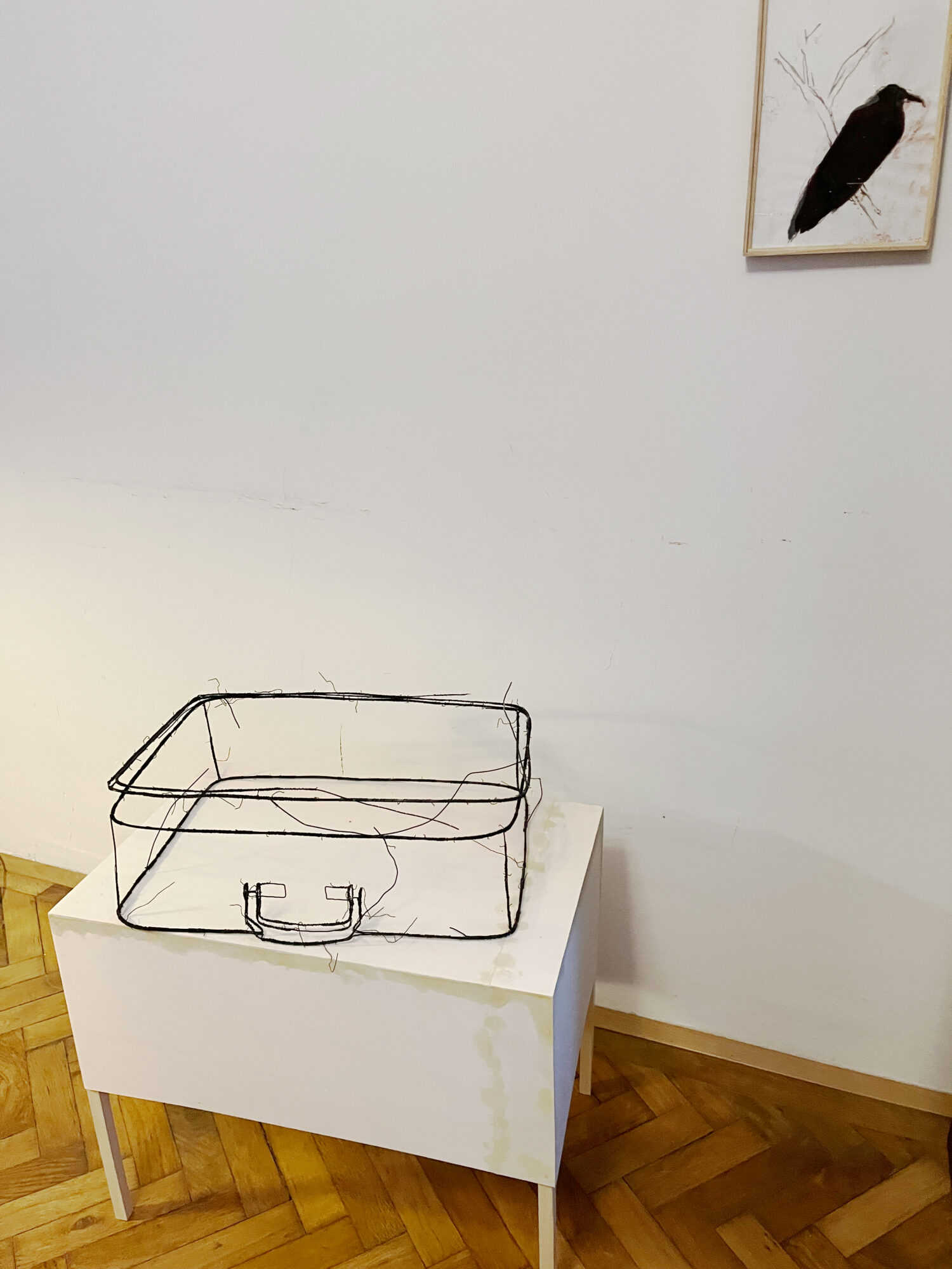 Die ersten Drahtskulpturen sind im Jahr 2000 entstanden. Ich nenne sie dreidimensionale Zeichnungen. Zum Beispiel ein Reisekoffer, eine Schuhschachtel, ein Waschbecken, ein Plattenspieler, eine Wiener Würfeluhr. Draht hat weniger Körper als Karton. Was in der Skulptur bleibt, ist der Strich der Zeichnung.