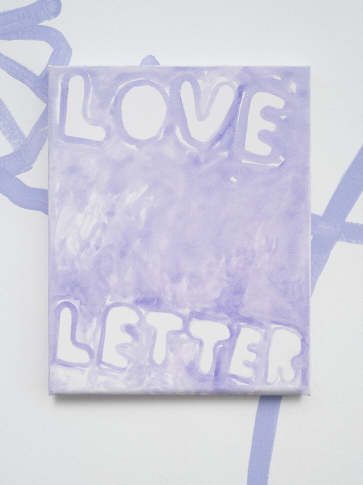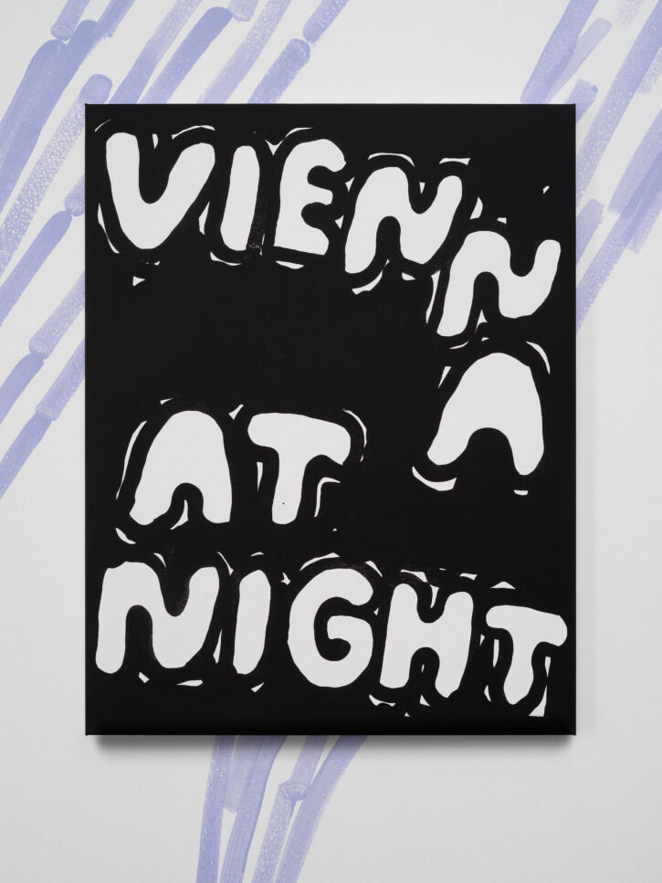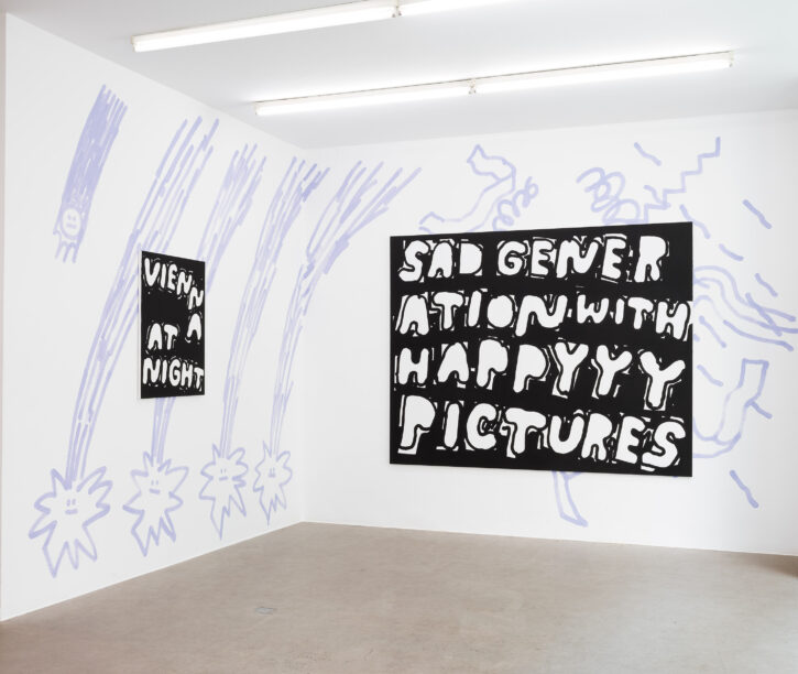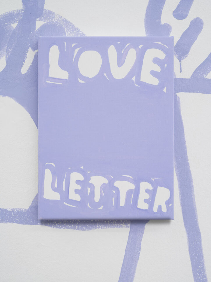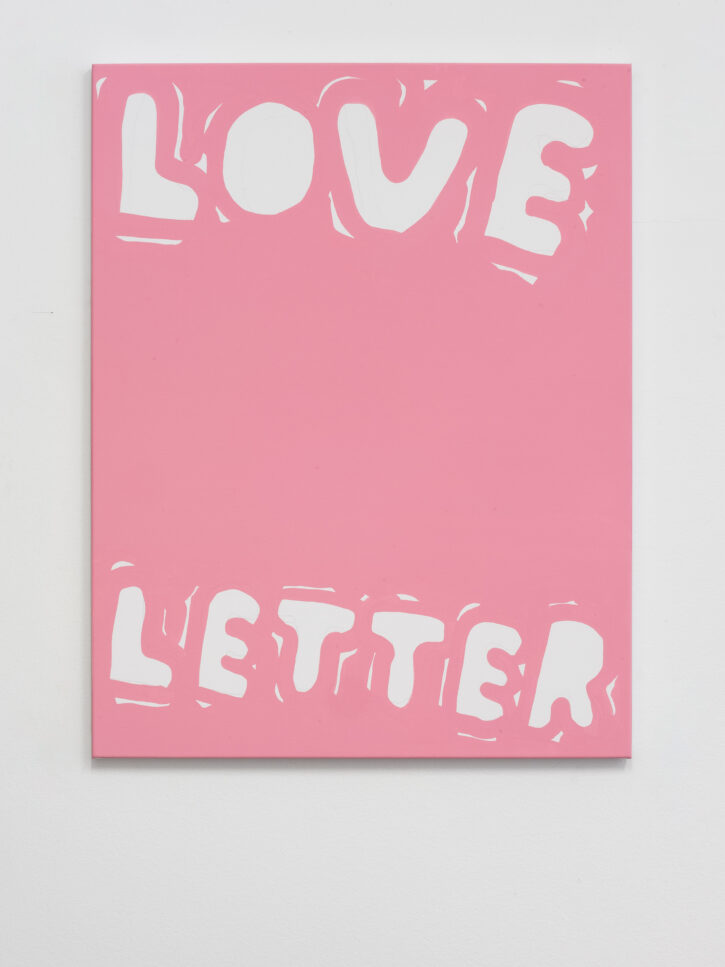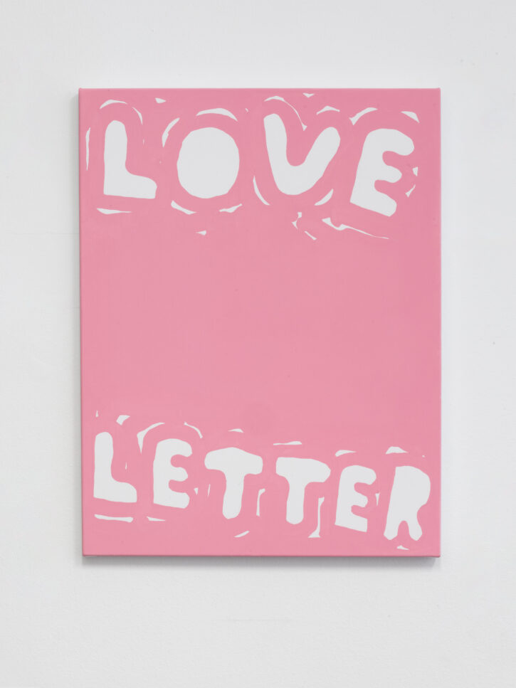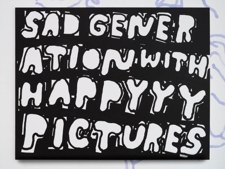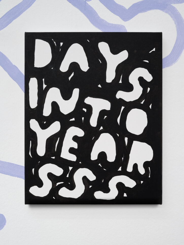 Ein Beispiel dafür ist das schwarz-weiße Gemälde „Sad Generation with Happyyy Pictures“. Mit der Präzision eines Dichters gelingt es dem Künstler, mit nur wenigen spielerischen Worten unseren Zeitgeist zu verschriftlichen. Diese sprachliche Ökonomie ist zentral für sein Werk. Sie ist reduziert in der Form und kraftvoll in der Aussage. In der Arbeit „Love Letter“ wird das Gemälde selbst zum Brief. Statt einer wörtlichen Botschaft öffnet sich ein Raum für Vorstellungskraft. Die Bedeutung verschiebt sich von Betrachter*in zu Betrachter*in, während das zugrunde liegende Gefühl universell verständlich ist. Auf diese Weise wird Sprache bei Marx zu einer gemeinsamen emotionalen Erfahrung. Selbst bei ernsten Themen durchzieht seine Werke stets ein subtiles Augenzwinkern – Tragikomik ist sein Markenzeichen. Eine weitere Ebene seiner unverwechselbaren Typografie liegt in der Ausdehnung der Worte über die gesamte Leinwand, sodass der Text den Raum vollständig einnimmt. In Arbeiten wie „days into yearsss“ verlängert das wiederholte „s“ das gesprochene Wort und macht daraus eine serielle, rhythmische Geste.