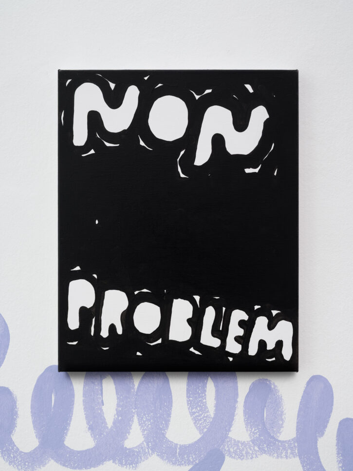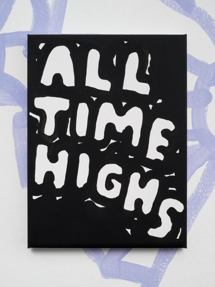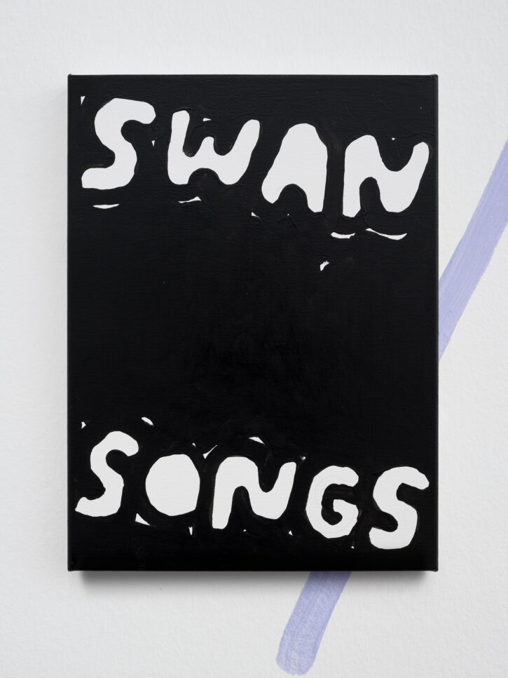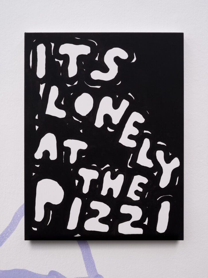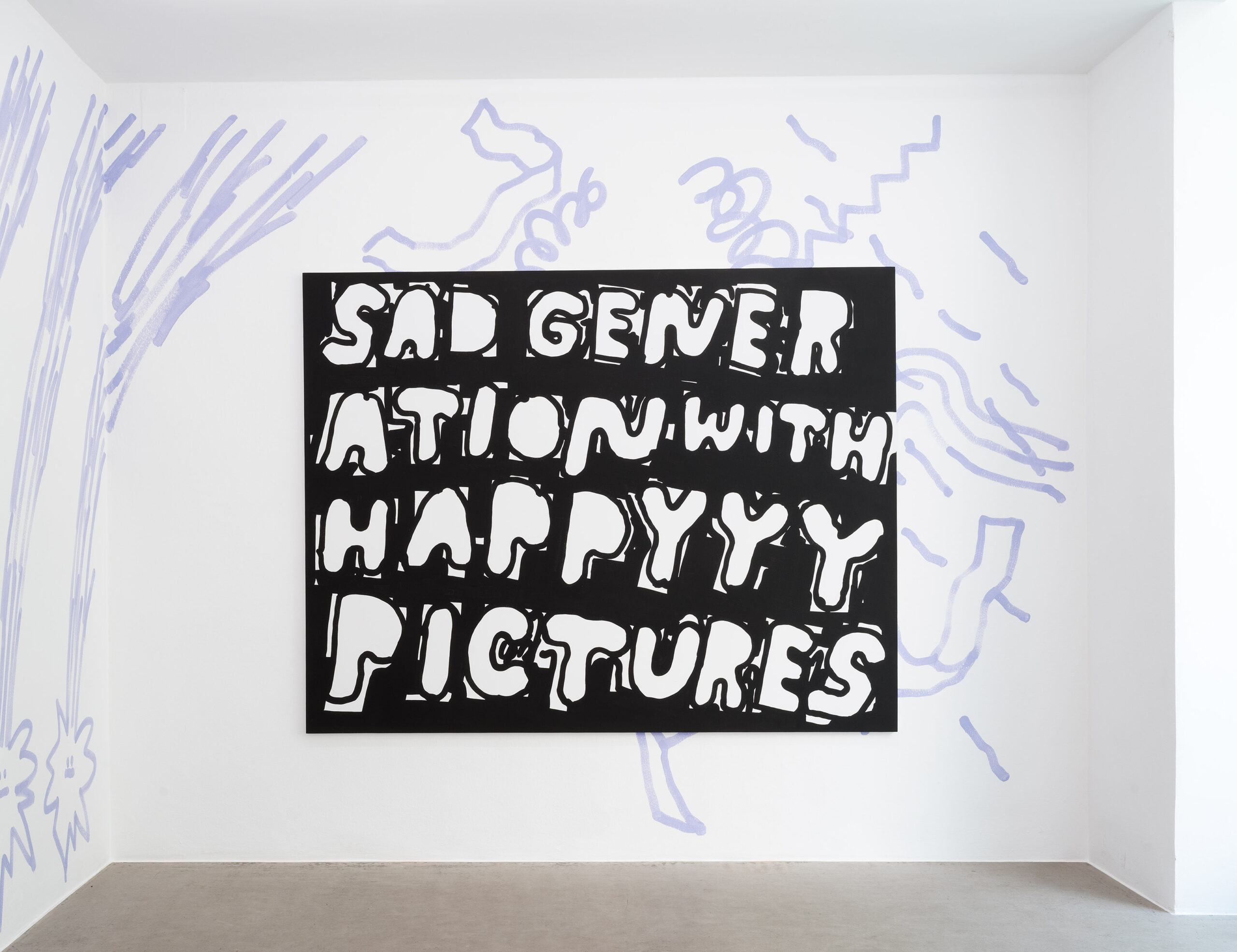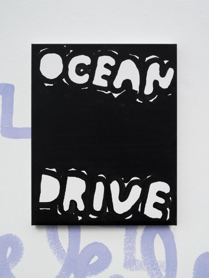 Ein Beispiel dafür ist das schwarz-weiße Gemälde „Sad Generation with Happyyy Pictures“. Mit der Präzision eines Dichters gelingt es dem Künstler, mit nur wenigen spielerischen Worten unseren Zeitgeist zu verschriftlichen. Diese sprachliche Ökonomie ist zentral für sein Werk. Sie ist reduziert in der Form und kraftvoll in der Aussage. In der Arbeit „Love Letter“ wird das Gemälde selbst zum Brief. Statt einer wörtlichen Botschaft öffnet sich ein Raum für Vorstellungskraft. Die Bedeutung verschiebt sich von Betrachter*in zu Betrachter*in, während das zugrunde liegende Gefühl universell verständlich ist. Auf diese Weise wird Sprache bei Marx zu einer gemeinsamen emotionalen Erfahrung. Selbst bei ernsten Themen durchzieht seine Werke stets ein subtiles Augenzwinkern – Tragikomik ist sein Markenzeichen. Eine weitere Ebene seiner unverwechselbaren Typografie liegt in der Ausdehnung der Worte über die gesamte Leinwand, sodass der Text den Raum vollständig einnimmt. In Arbeiten wie „days into yearsss“ verlängert das wiederholte „s“ das gesprochene Wort und macht daraus eine serielle, rhythmische Geste.