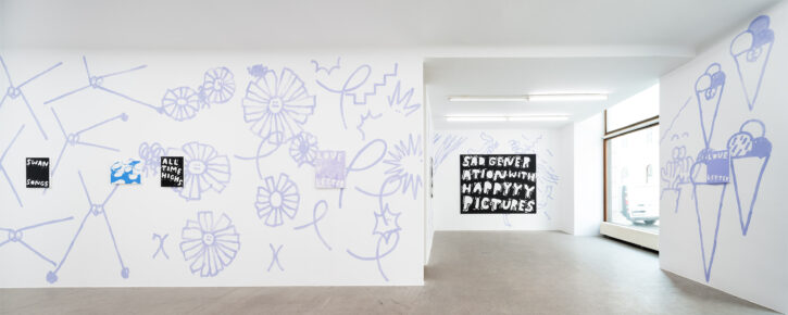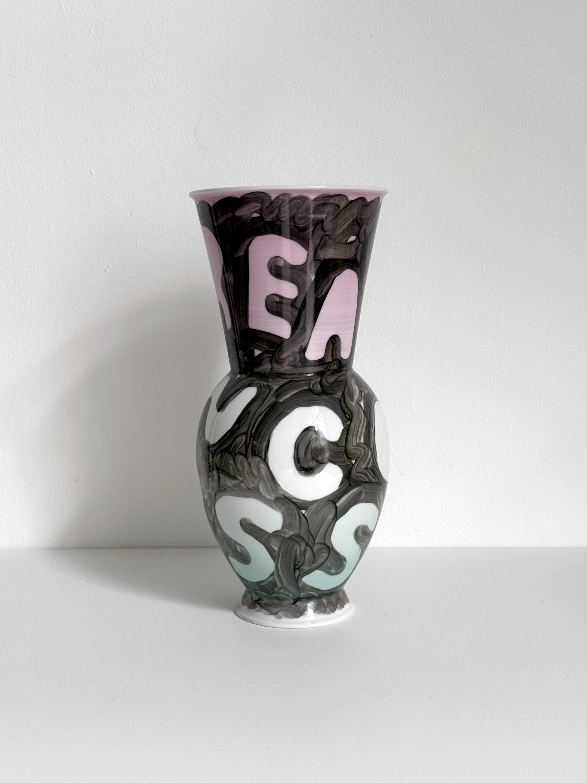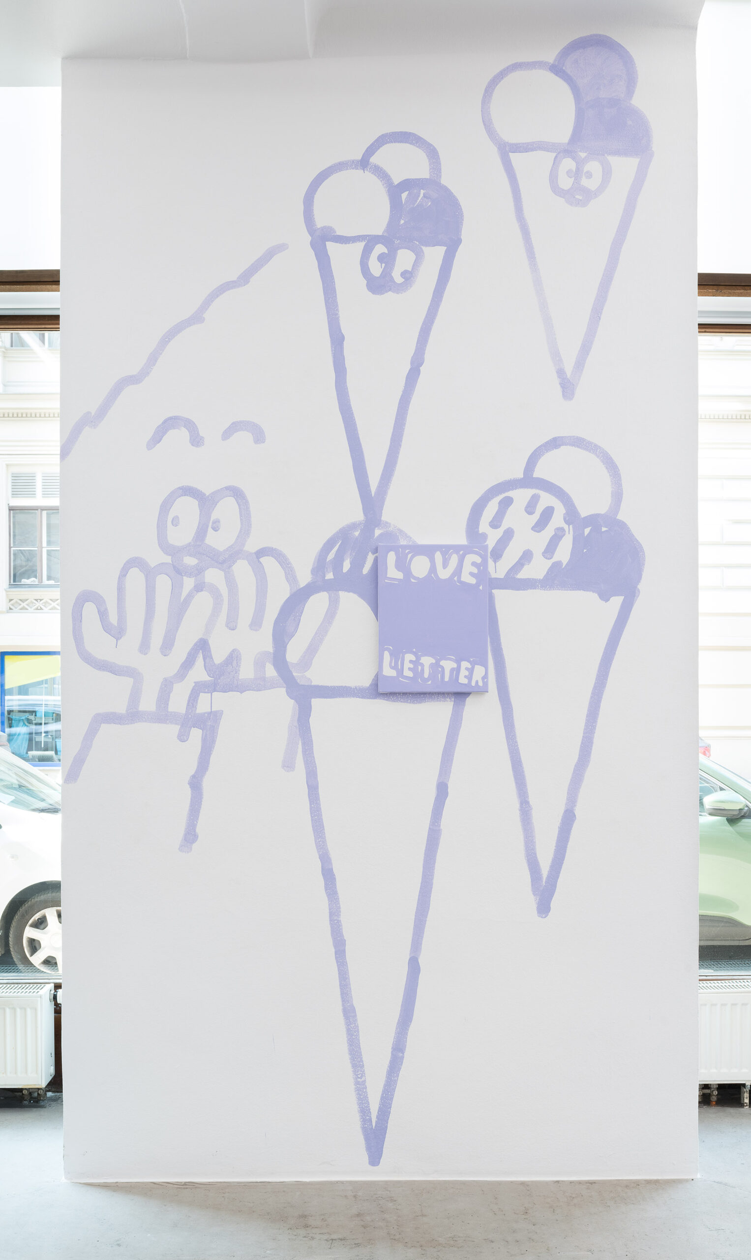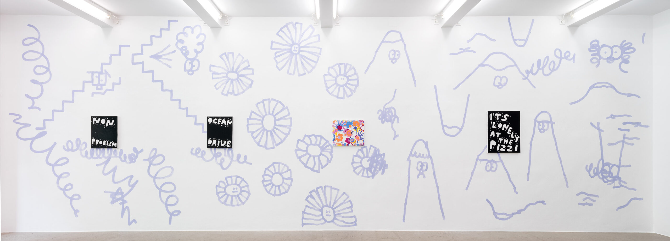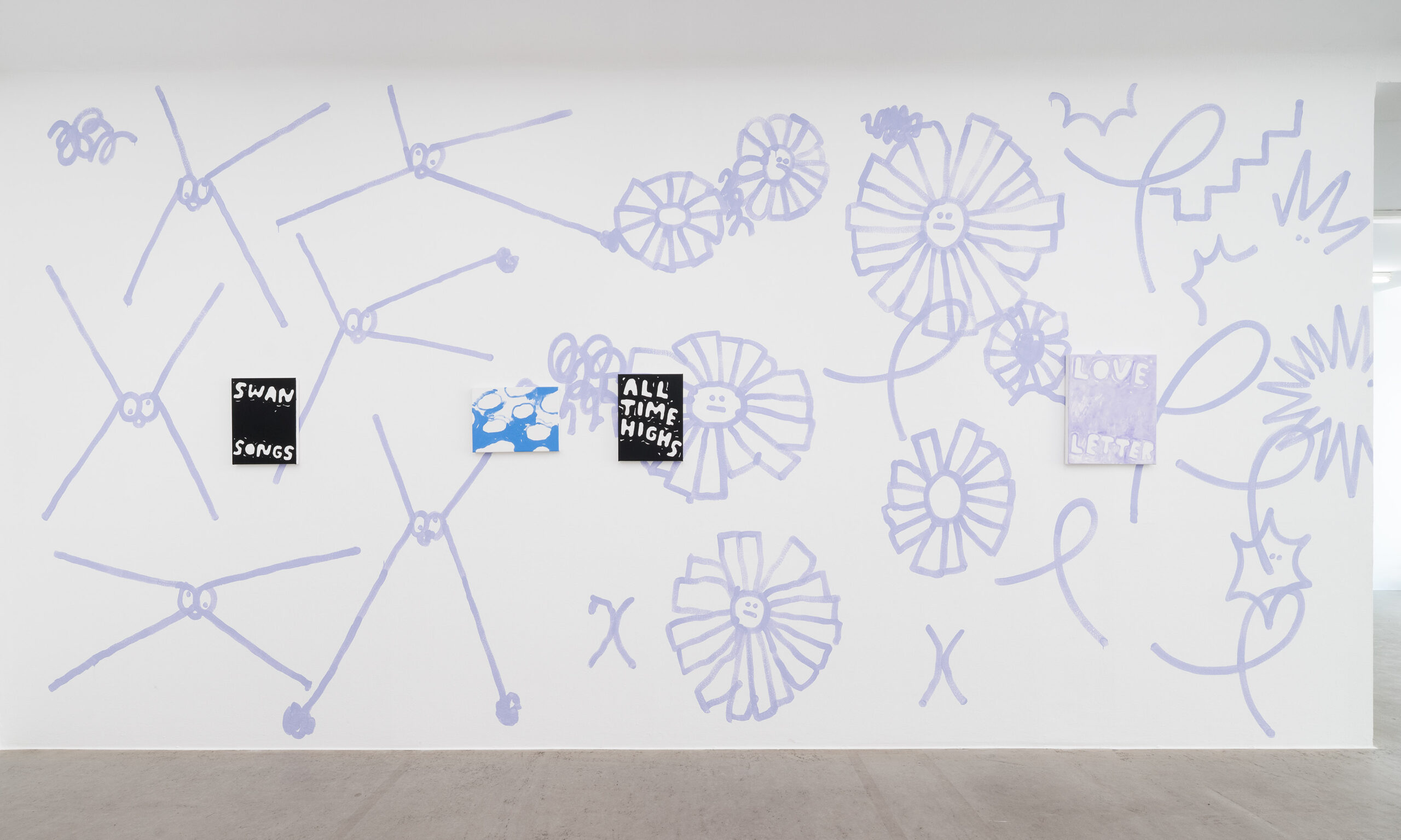 Ein Beispiel dafür ist das schwarz-weiße Gemälde „Sad Generation with Happyyy Pictures“. Mit der Präzision eines Dichters gelingt es dem Künstler, mit nur wenigen spielerischen Worten unseren Zeitgeist zu verschriftlichen. Diese sprachliche Ökonomie ist zentral für sein Werk. Sie ist reduziert in der Form und kraftvoll in der Aussage. In der Arbeit „Love Letter“ wird das Gemälde selbst zum Brief. Statt einer wörtlichen Botschaft öffnet sich ein Raum für Vorstellungskraft. Die Bedeutung verschiebt sich von Betrachter*in zu Betrachter*in, während das zugrunde liegende Gefühl universell verständlich ist. Auf diese Weise wird Sprache bei Marx zu einer gemeinsamen emotionalen Erfahrung. Selbst bei ernsten Themen durchzieht seine Werke stets ein subtiles Augenzwinkern – Tragikomik ist sein Markenzeichen. Eine weitere Ebene seiner unverwechselbaren Typografie liegt in der Ausdehnung der Worte über die gesamte Leinwand, sodass der Text den Raum vollständig einnimmt. In Arbeiten wie „days into yearsss“ verlängert das wiederholte „s“ das gesprochene Wort und macht daraus eine serielle, rhythmische Geste.