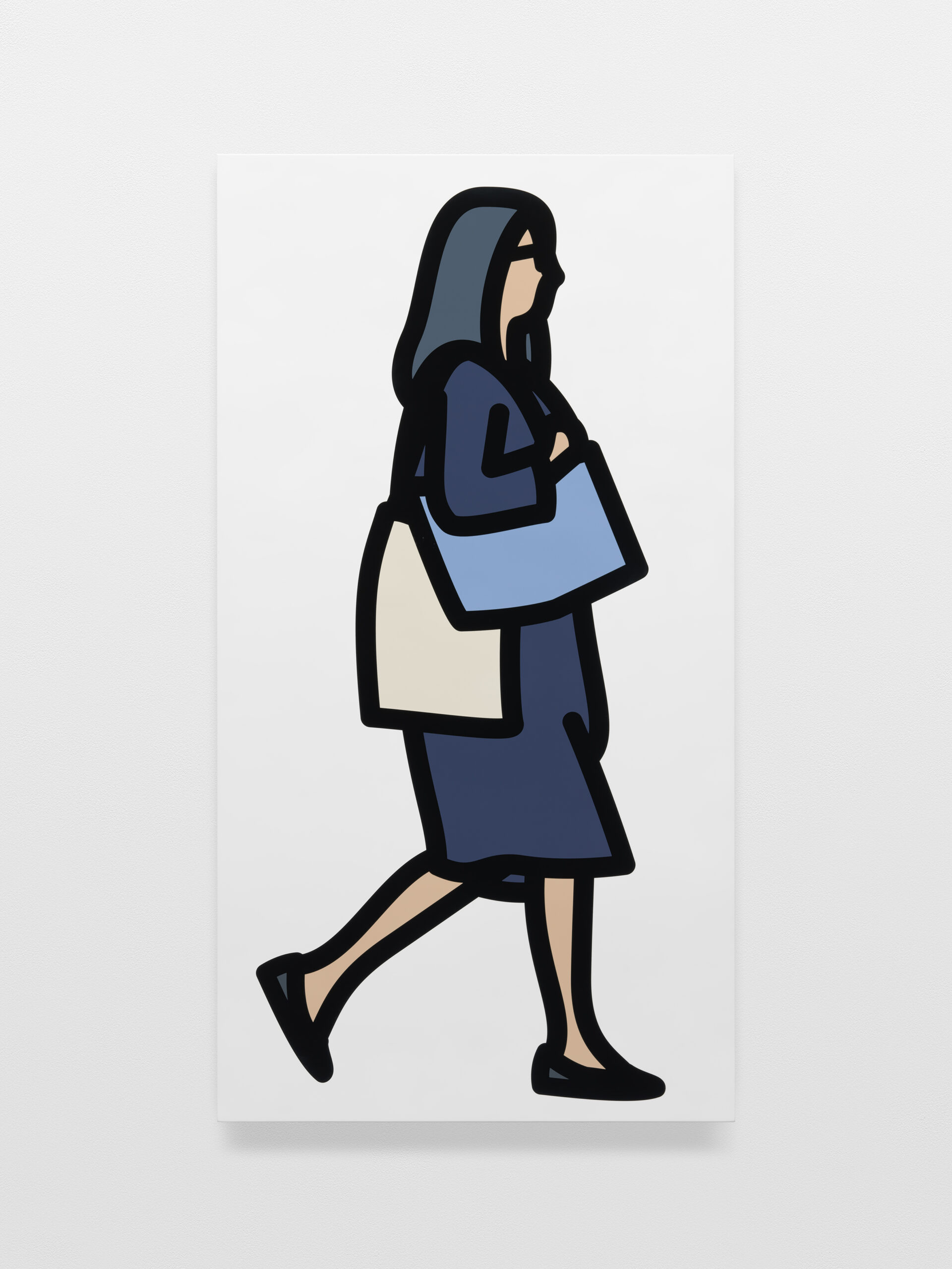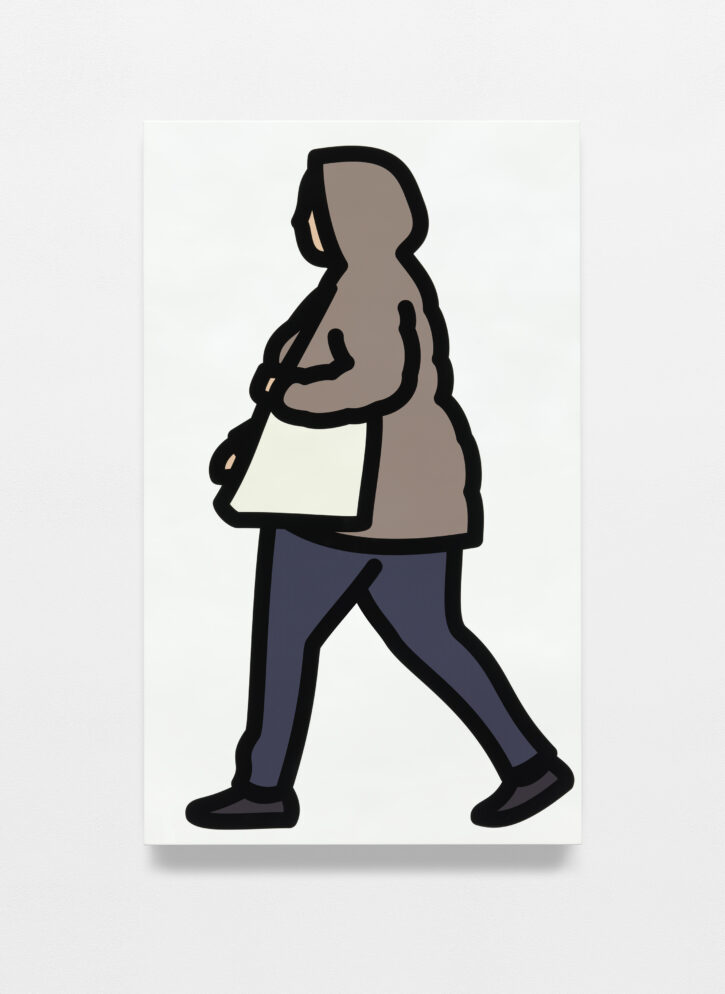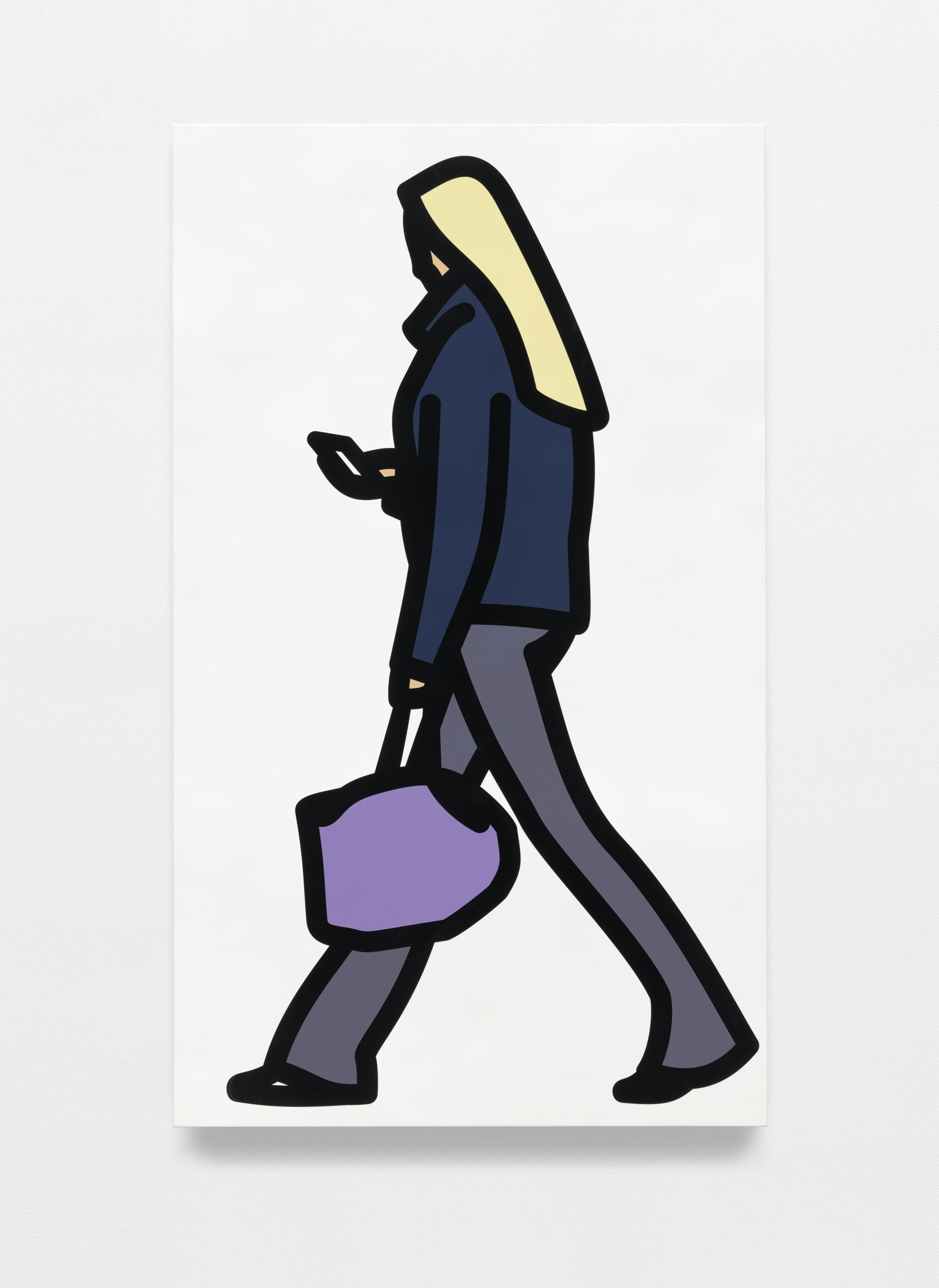 Warhol wrote of making an artwork, ‘If you don’t think about it, it’s right. As soon as you have to decide and choose, it’s wrong. And the more you decide about, the more wrong it gets.” I find that’s a good guide. The rules of composition are based on maximum difference and rhythm. An even mix of dark and light clothing of short and tall people (which often tends to be male and female), a mix across the canvas of dark and blonde hair, visible and clothed limbs, direction of walk.