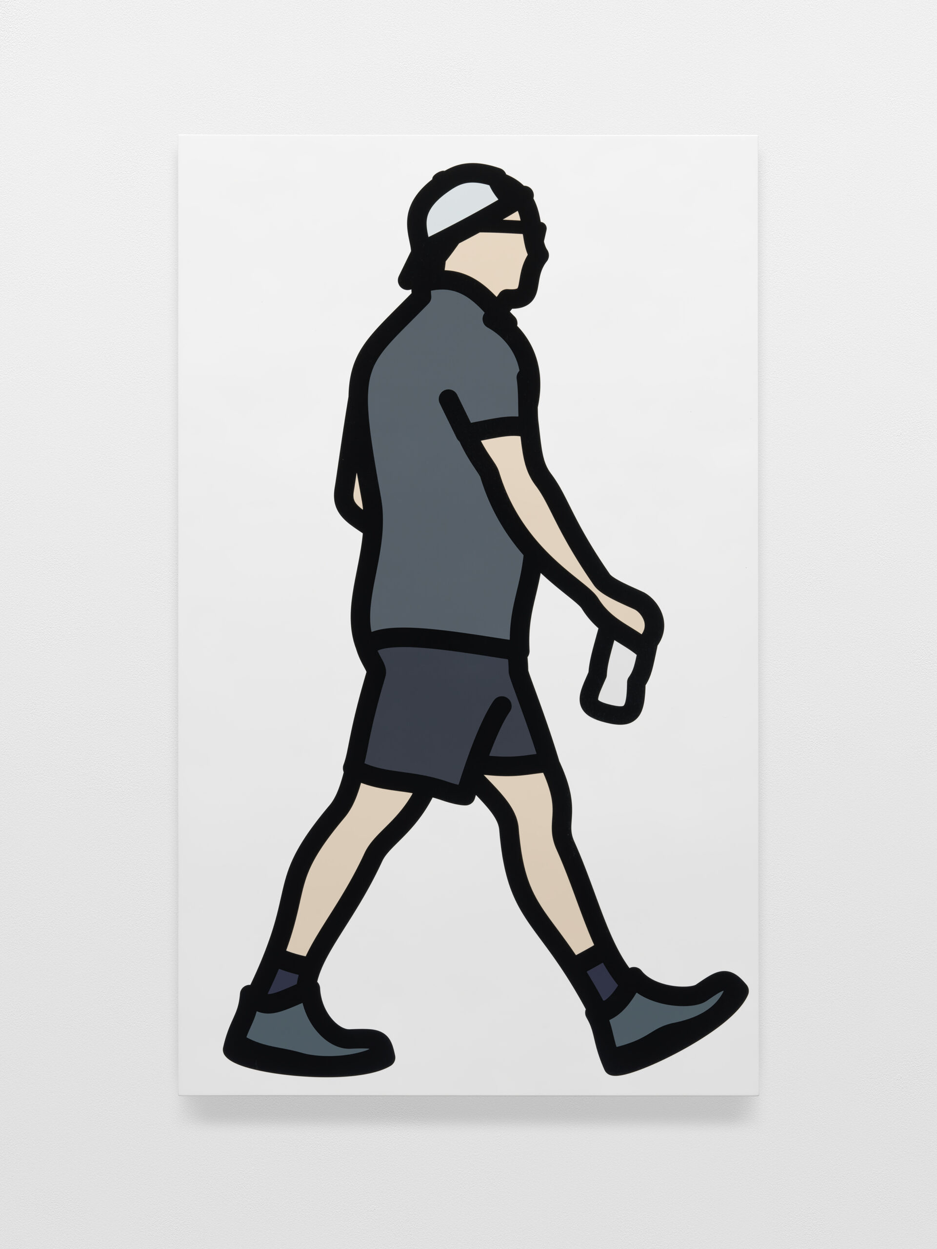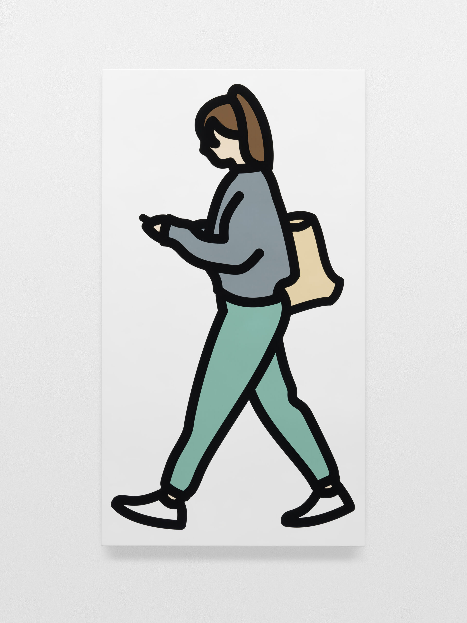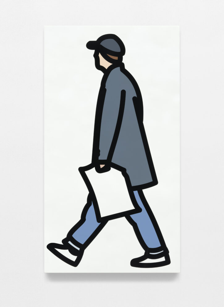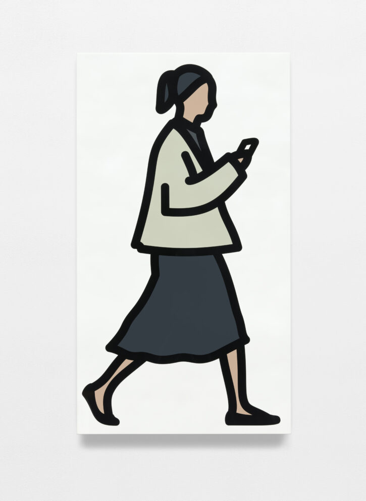 Warhol wrote of making an artwork, ‘If you don’t think about it, it’s right. As soon as you have to decide and choose, it’s wrong. And the more you decide about, the more wrong it gets.” I find that’s a good guide. The rules of composition are based on maximum difference and rhythm. An even mix of dark and light clothing of short and tall people (which often tends to be male and female), a mix across the canvas of dark and blonde hair, visible and clothed limbs, direction of walk.