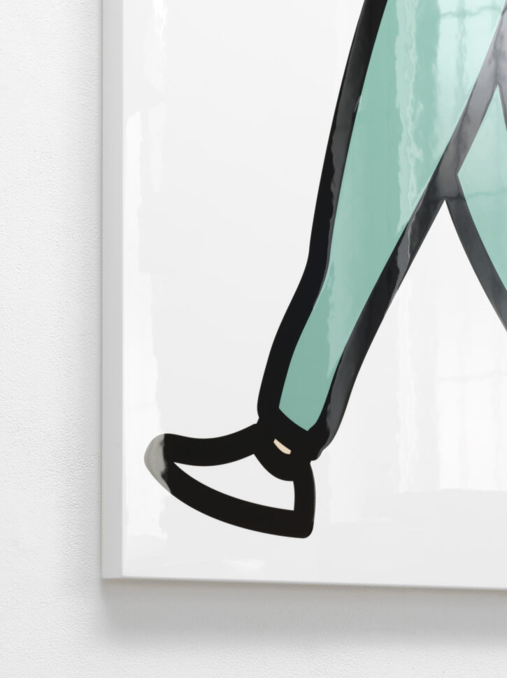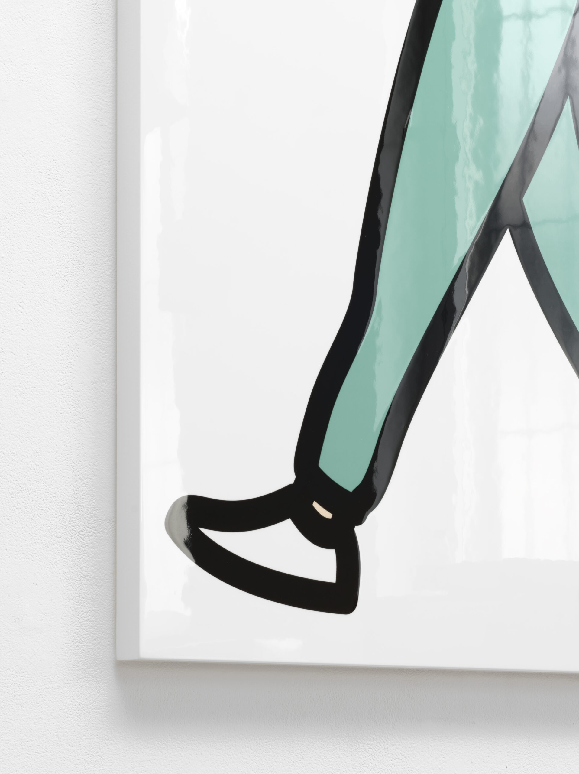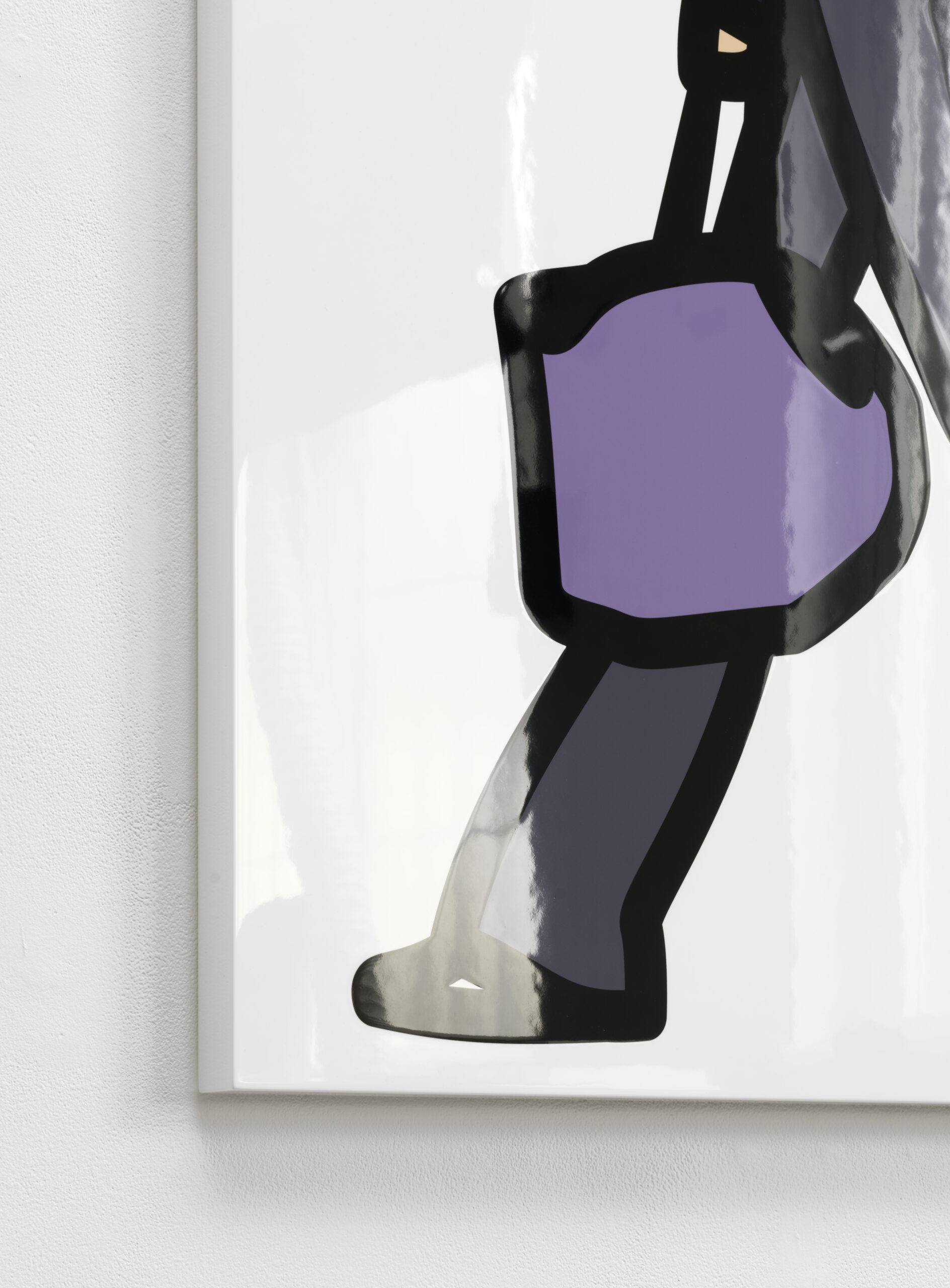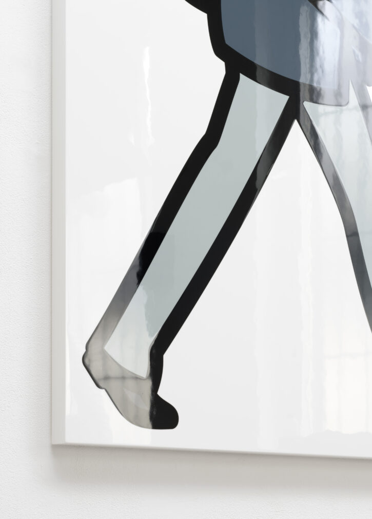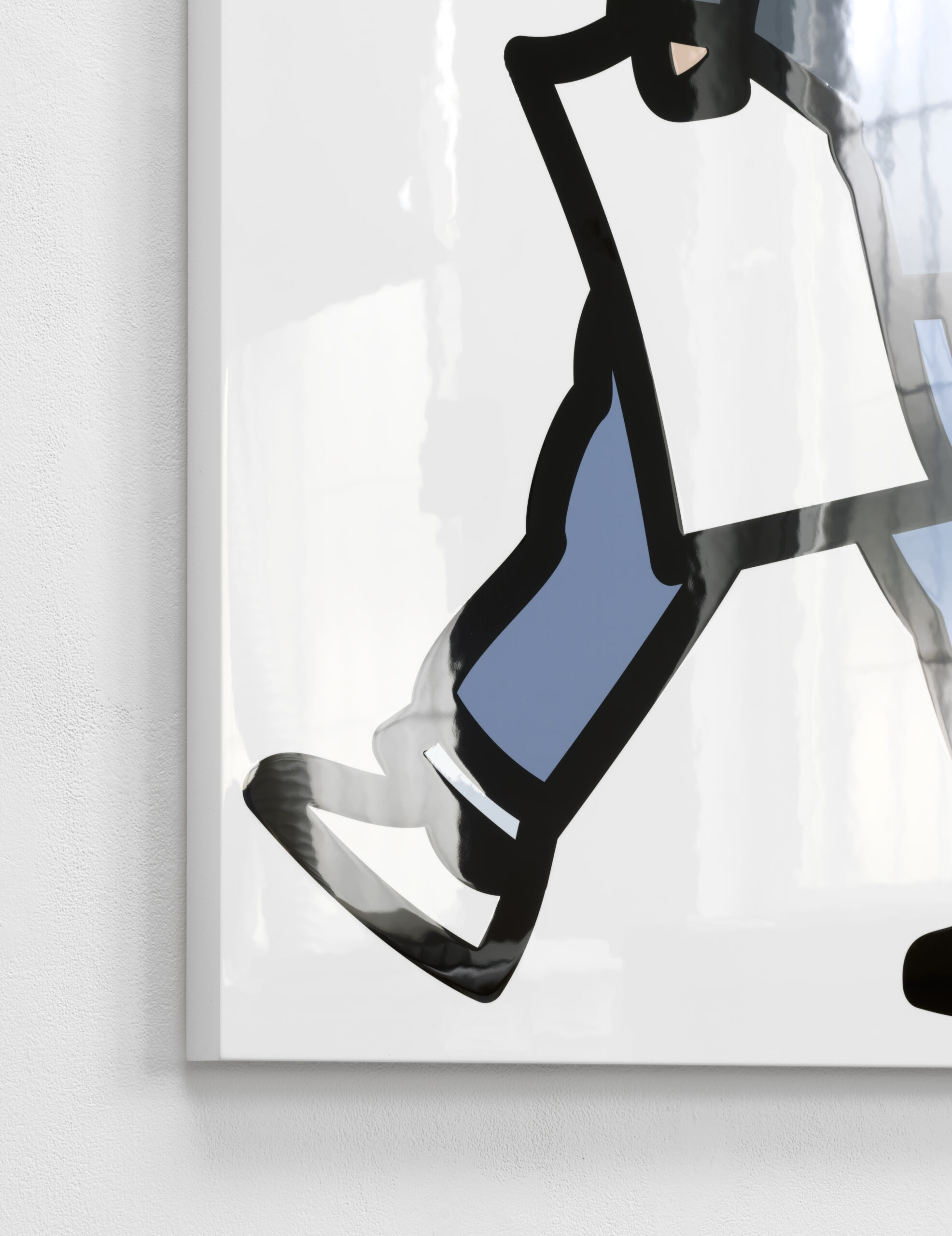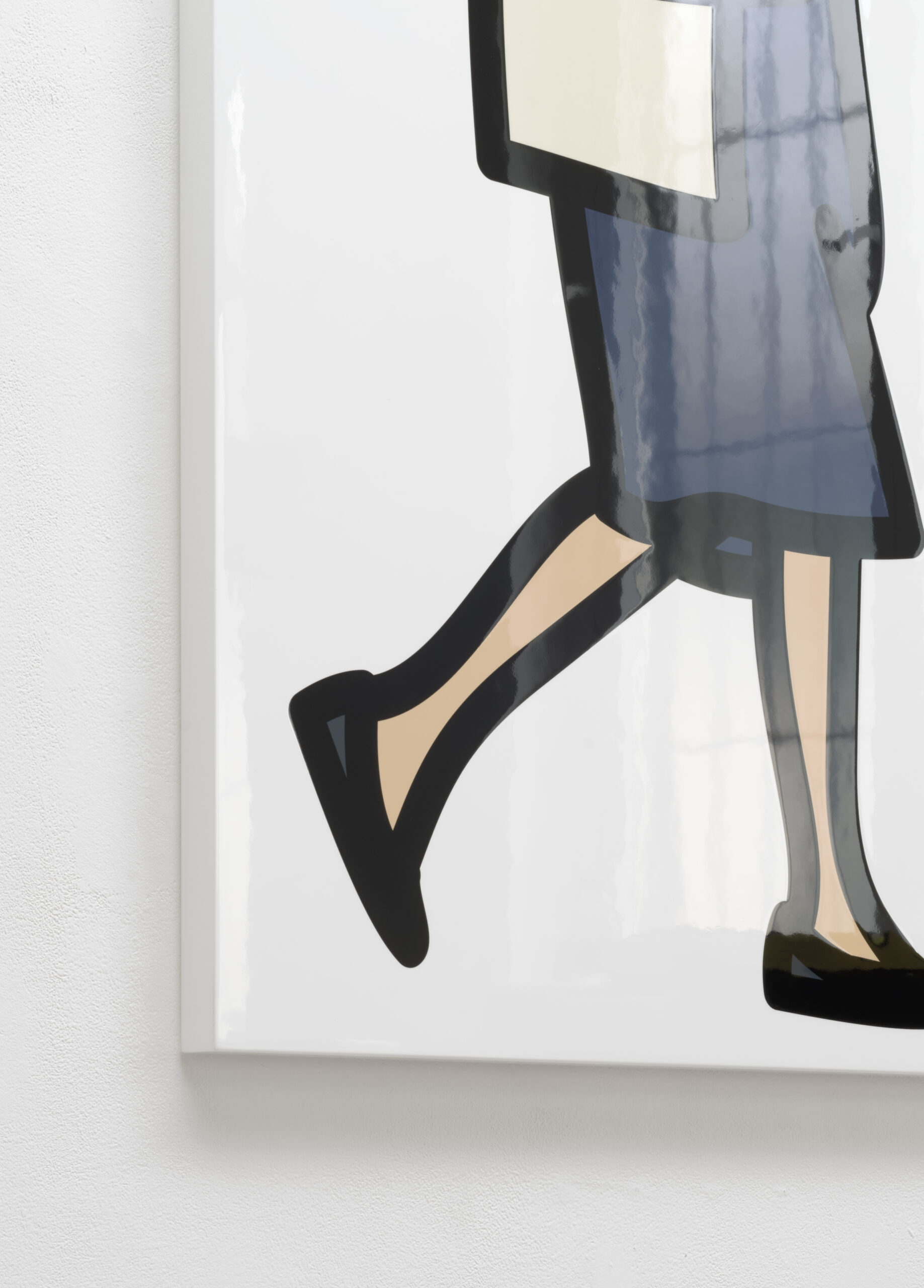 Like the people themselves, the painting system I have used is taken from the street. The most ubiquitous form of city outdoor imaging might well be this cut vinyl on stretched nylon sheet used for signage and advertising, but here used as a very sensible and seamless way of making a large image. In fact, there is almost no limit to the scale that is possible. Meanwhile I have the 40 individual figures to play with. The stretched vinyl system makes little sense in this smaller scale and since the viewer will be closer to the image, it seems possible to push the surface to an extreme of high gloss and pure seamlessness. Unlike etching and lithography, silkscreen used to be considered too lowly a technology to use for art, like a ballpoint pen. But slowly it has become the deluxe choice for printing, while inkjet became the lowly office form of printing that couldn’t be trusted for artworks. Now in fact inkjet printing has taken over; it’s cleaner and easier and gives an even richer surface. No more tricky edges to line up or hairs in the ink or tedious, slow colour proofing. I spray a thick layer of varnish over the whole object to give the image an even more removed and dreamy quality, perhaps a bit like looking through glass.