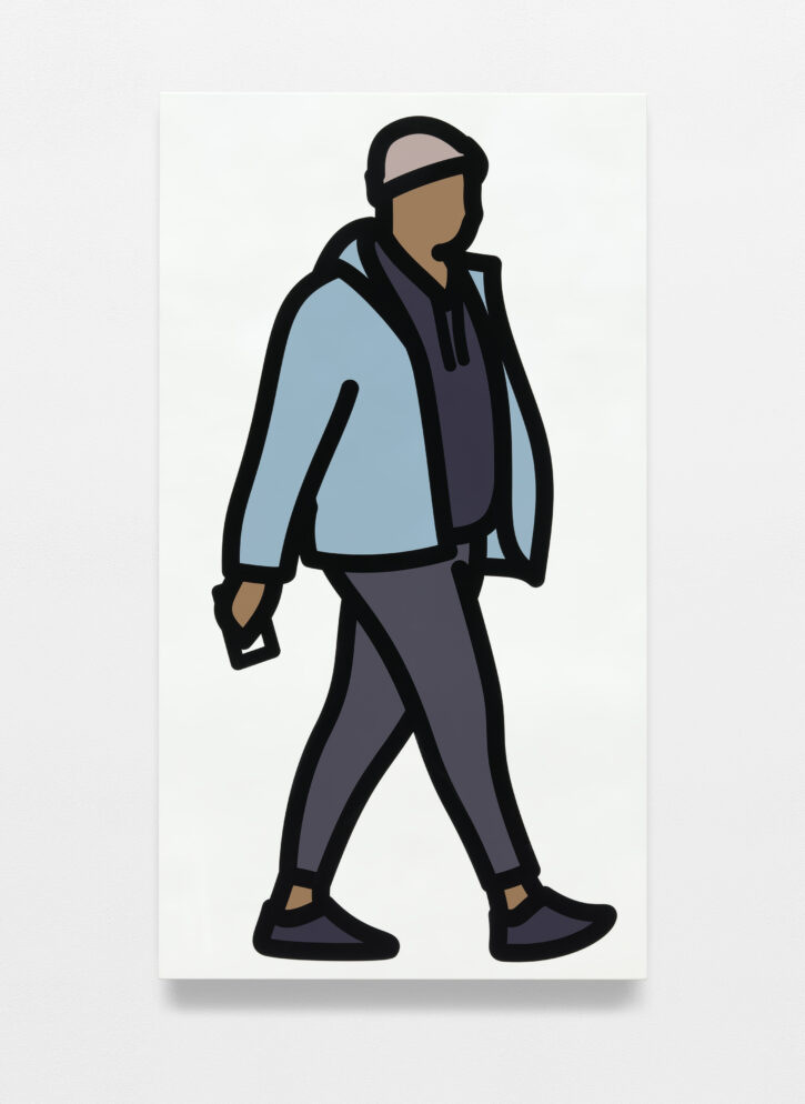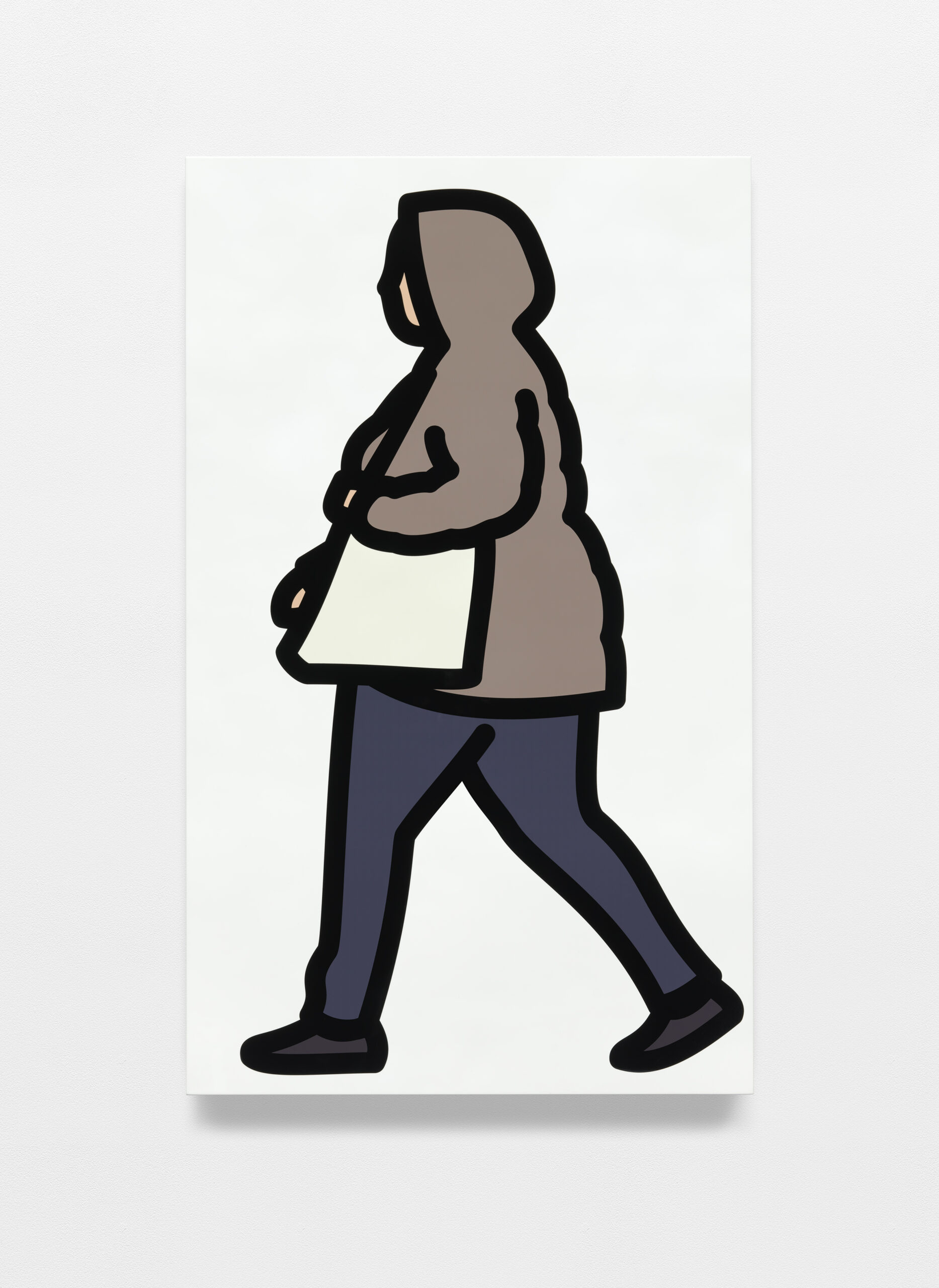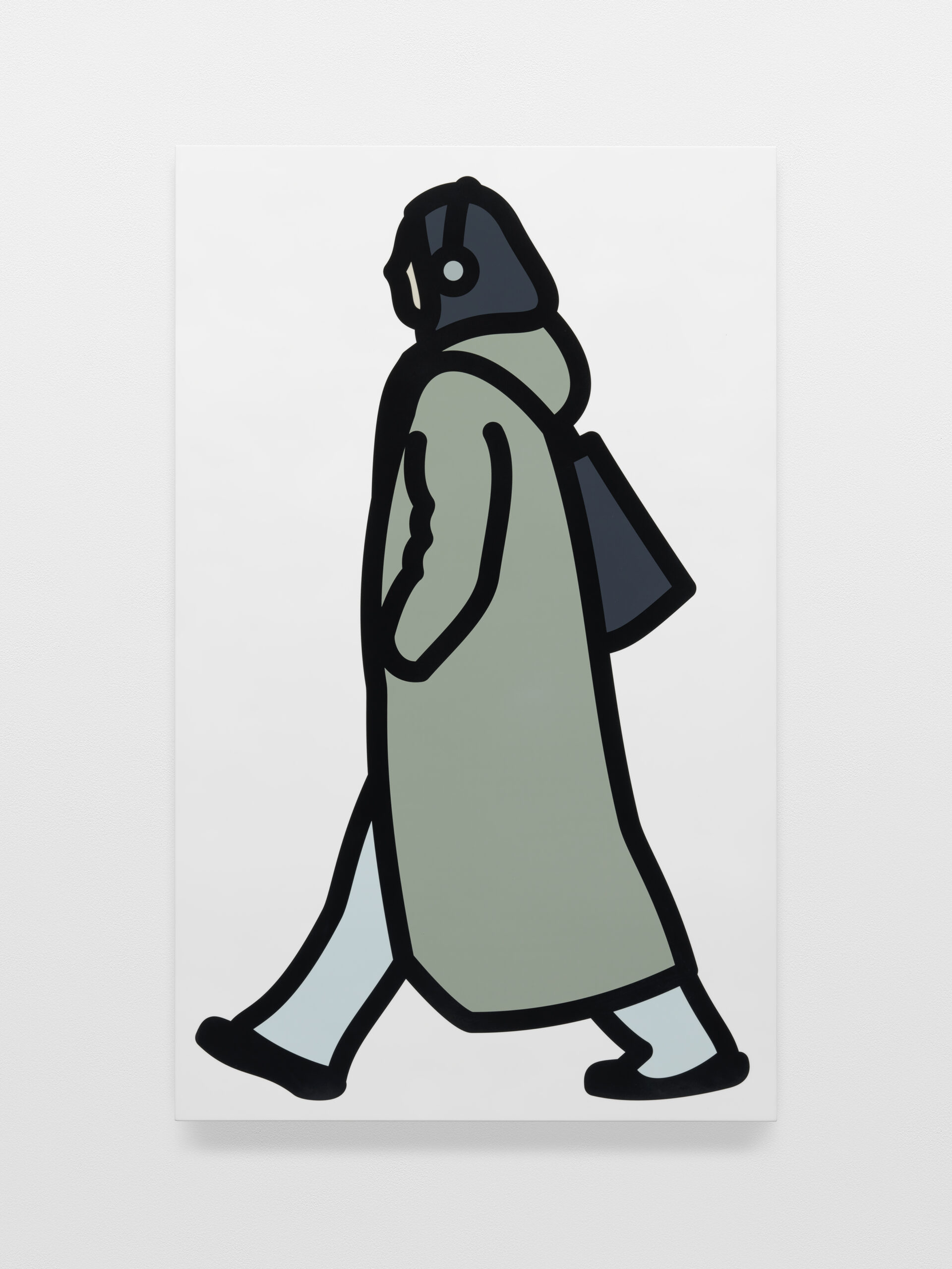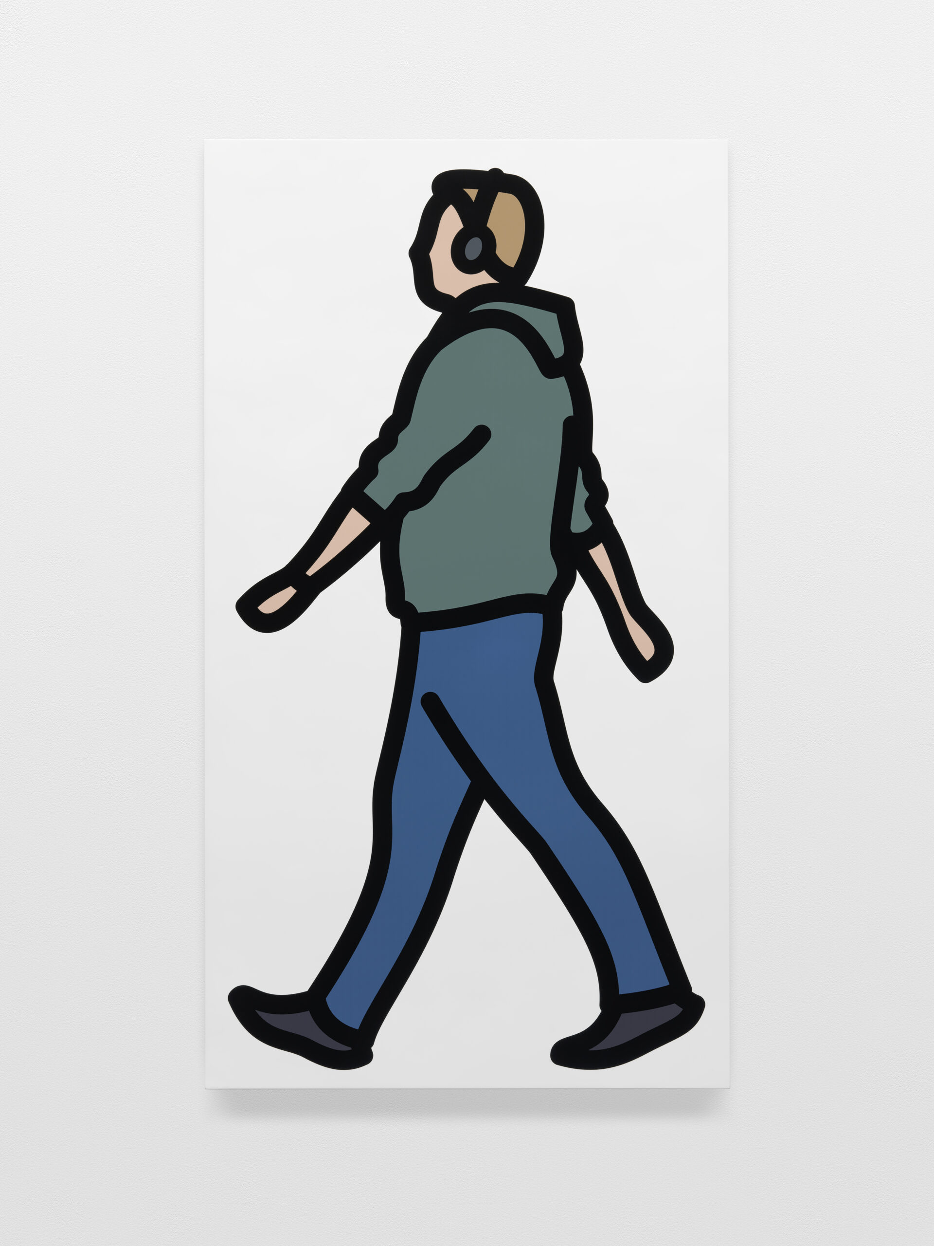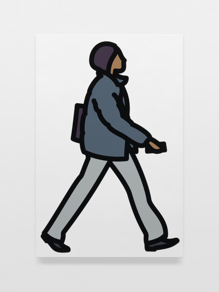 My first aim was to make very large-scale group paintings that echoed classical friezes depicting striding Assyrian warriors or gift-offering Egyptians, but using everyday contemporary people. I have experimented with drawing friends or people paid to come in from the street to be filmed, but the glory of filming out on the street, which is arduous and slightly frightening, is that you get the raw truth. I didn’t notice at the time, but most people are wearing baggy clothes which my children tell me are fashionable right now. Many people look at their phones and each walks in their own personal way and speed. The way you walk is as telling as your voice or handwriting. I can capture these qualities without making any decisions myself. Only when I combine the figures in groups of four do I get involved in decisions.