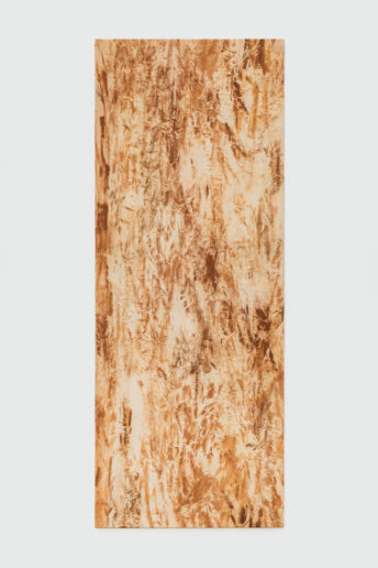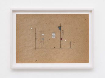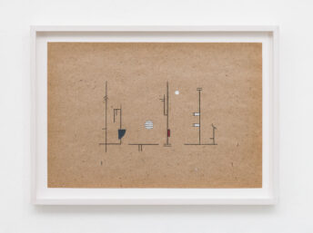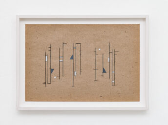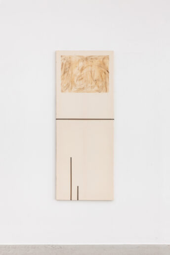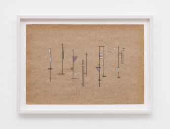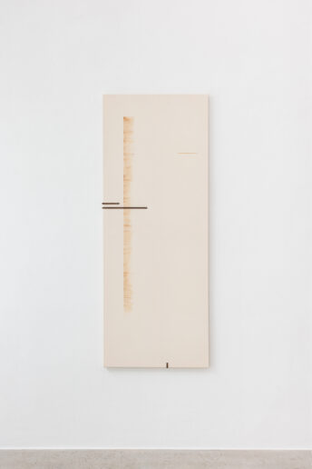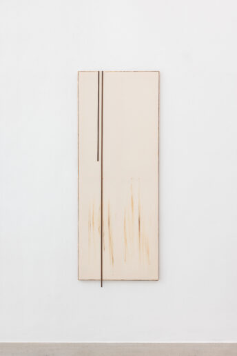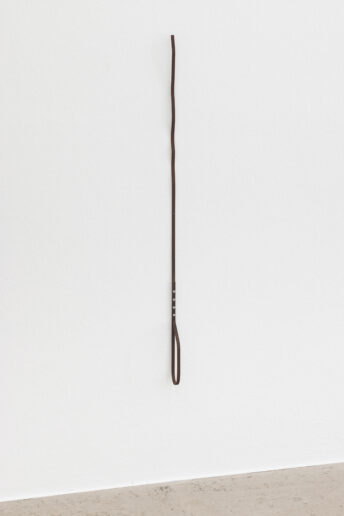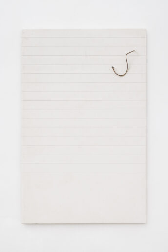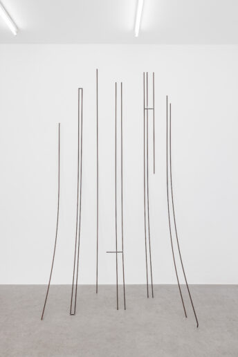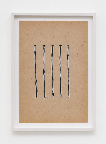 Die Lebendigkeit dieses unaufhaltsamen Zerfallsprozesses bringt Ender in ein körperliches Verhältnis zwischen Objekten und Zeichenanordnungen. Sie reibt feinen Roststaub von korrodierten Metalloberflächen direkt auf Leinwände, um abstrakte, intuitiv gesetzte Spuren auszubilden. Die gelösten, porösen Eisenoxidpigmente, die zwischen Orangerot und Brauntönen wechseln, spiegeln die Tiefe der Schleifschichten wider. Die partiell abgeriebenen und so quasi-gesäuberten Metallobjekte komponiert die Künstlerin wiederum zu raumgreifenden Installationen, die in einer fragilen Balance zwischen temporärem Innehalten und eigengewichtiger Permanenz harren. Oder aber sie stehen den zweidimensionalen Bildträgern als prothesenhafte Apparaturen bei und artikulieren präzise konstruierte Linien, die erneut auf die Relevanz von Sprach- und Zeichensystemen verweisen. Auch die bislang selten gezeigten Zeichnungen Enders zeugen von ihrer tieferen Beschäftigung mit Rhythmus, Semiotik und Taktilität. gently tap, hold and scratch rekurriert schließlich auf ein performatives Arbeiten, in dem sich das feinfühlige künstlerische Tun untrennbar mit den skulpturalen Qualitäten der erzeugten Konstellationen verbindet.