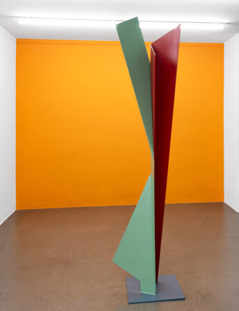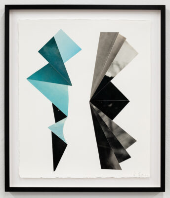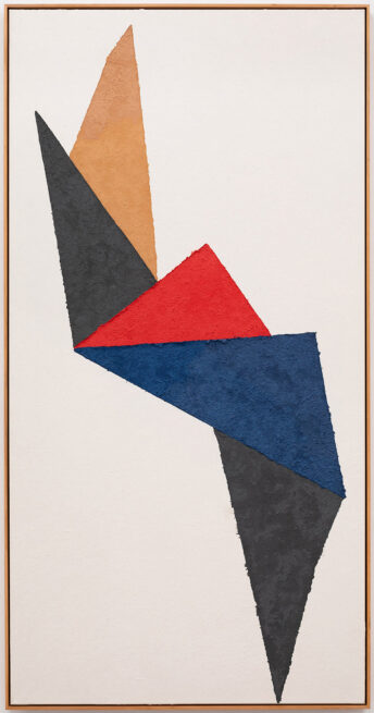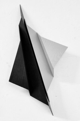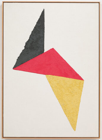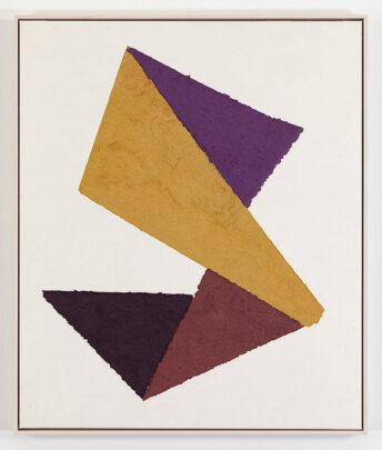Die Arbeit an möglichen ‚Zuständen’ von Formen und ihrer damit verbundenen sinnlichen Reichweite bestimmt das Werk der Künstlerin grundlegend. Bereits in ihren ersten Papierarbeiten, in welchen Papierschnipsel, vergleichbar mit spitz zulaufenden Zeigern, auf einem Träger arrangiert sind, zeigt sich in deren oft fallender Richtung und Lage die ehemals abstrakte, überzeitliche Schwerelosigkeit konstruktivistischer Kompositionen verloren. Allerdings gleichsam als Relikt bewahrt. Nun, in der neuen Werkgruppe der „Pulp Paintings“, erscheint das Tafelbild als Gravitationsfeld handgeschöpfter geometrischer Papierelemente, die, obgleich miteinander formal verbunden, zueinander in Stellung und Opposition gebracht sind. Die „Pulp Paintings“ sind Schauplätze eines, wie die Künstlerin es nennt, ‚temporalen Gefüges’, dessen Abwicklung und Verlauf nicht abgeschlossen erscheint. Es sind Formstrukturen in Faltung und Fall in der Jetzt-Zeit ihrer Bildlichkeit – möglicherweise Zeichen des Übergangs.