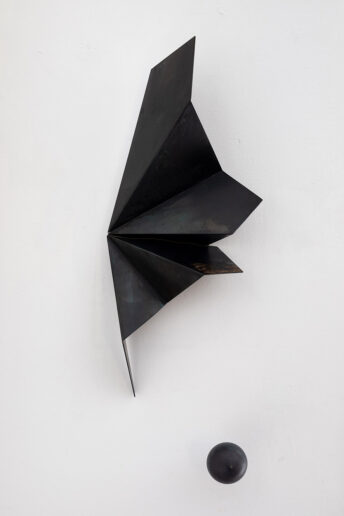 Dem Dogma des Modernen stellen Künstlerinnen und Künstler wie Katja Strunz Alternativen eines integrativen Denkens und Handelns gegenüber. Katja Strunz überführt den modernistischen Umgang mit Zeit und Raum, mit Chronologie und Linearität, in Werke über, in welchen sich durch Materialcollagen und durch die Konstellation von Materialfragmenten diachrone Bezugnahmen von Geschichte und Gegenwart vollziehen. Rostiges Eisen trifft dabei auf makelloses Holz oder blankes, schimmerndes Kupfer. Statt formalisierter Kontinuität zeichnen unterbrochene Zusammenhänge, also spezifische Diskontinuitäten, die Arbeiten von Katja Strunz aus: Zum Beispiel indem sie in ihren Buchdruckarbeiten die konventionelle Lesart von Sätzen verkehrt, Worte spiegelt, die Fotografie einer Landschaft mit ‚Continent’ überdruckt oder durch die Installation plastischer Faltungen einen Raum nicht gemäß orthogonaler Koordinaten dupliziert, sondern ihn als Struktur mit sichtbaren Mengen neu definiert und Räumlichkeit damit stellenweise absichtlich deformiert. Durch die plastische Deformation von Raum mittels Faltung, mit der sich Katja Strunz in ihren raumbezogenen Installationen und mit einzelnen Großskulpturen zwischen 2003 und 2008 im Kontext ihrer Werkgruppe „Zeittraum“ auseinandersetzte, hat sie traumatischen Symptomen, der depressiven Kontraktion des inneren Erlebens, eine sichtbare Formstruktur im Außen verliehen – welche die Künstlerin als Vektoren der Gegenwart in das jeweilige räumliche Umfeld platziert und sie darin integriert und eingeschrieben hat. Gleichermaßen frisst sich nun die Arbeit „Roomrobber“ (2017) in die makellosen Wände des White Cubes hinein, um dessen idealtypische Gestalt, gleich der Methodik eines Rorschachtests, projektiv und mehrdeutig zu konterkarieren.