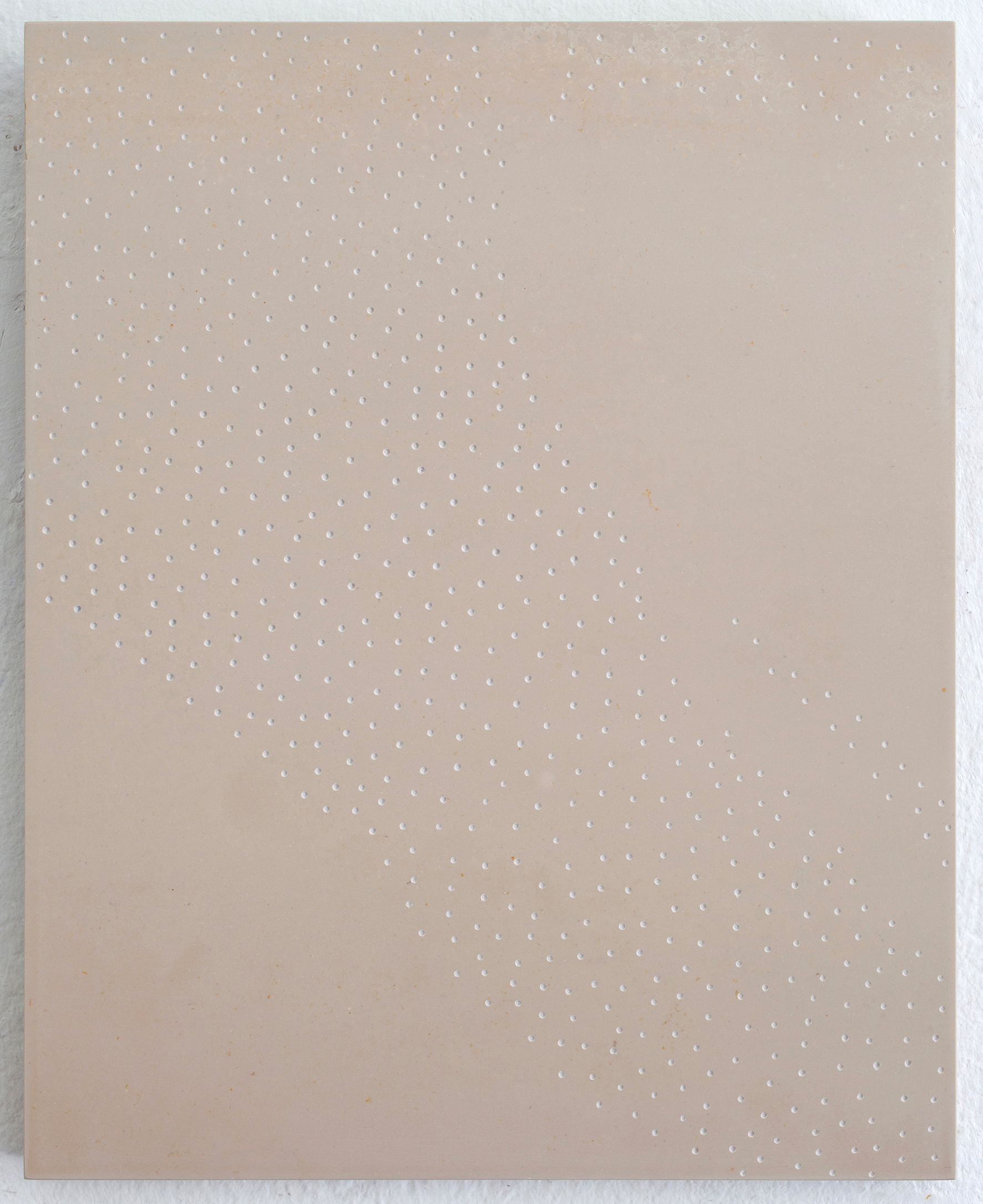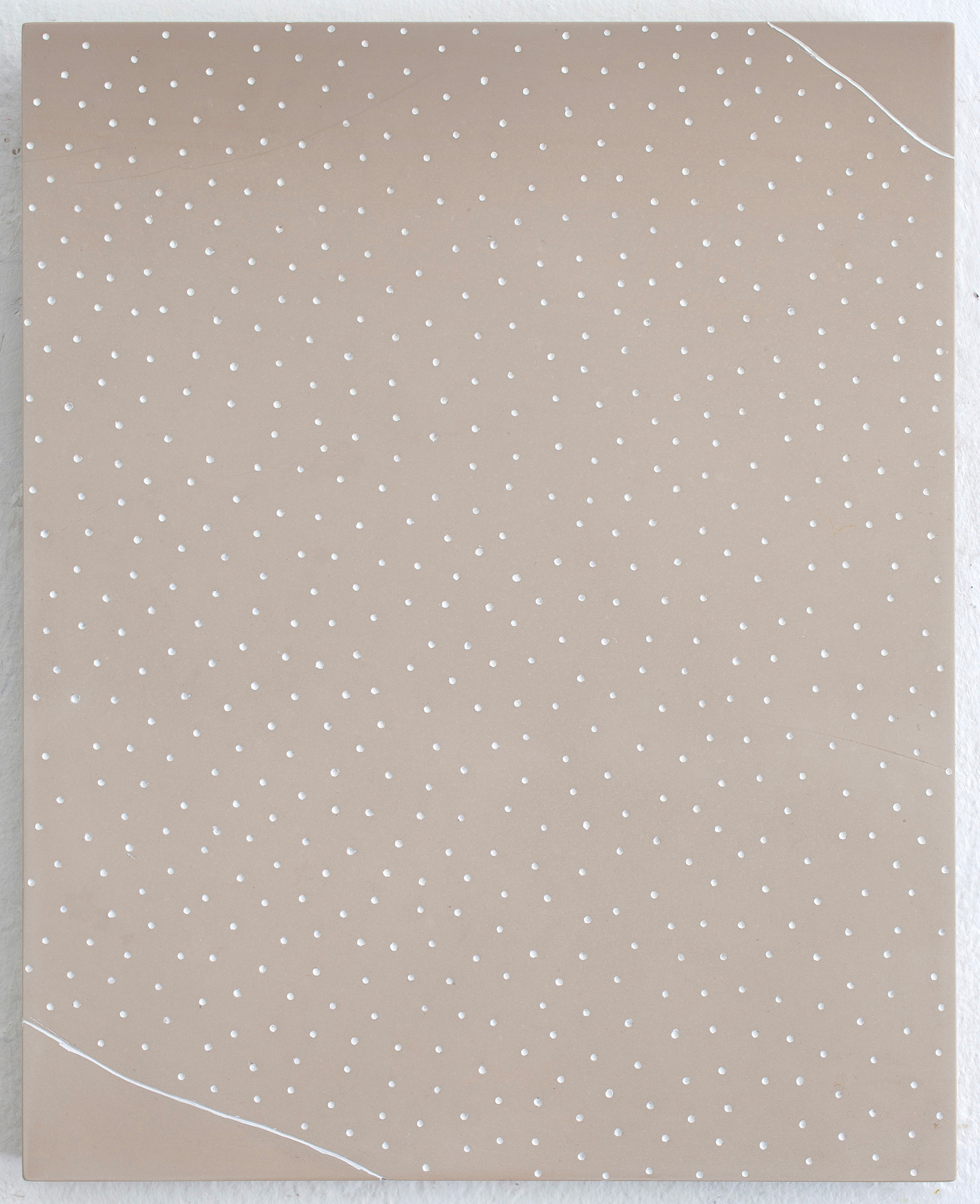 In der Werkgruppe der Collagen wird diese freie Linie wieder in die Fläche rückgebunden, um Räumlichkeit auf eine wieder andere Weise entstehen zu lassen. Die Linie dient nun als gestaltdefinierender Umriss. Die Künstlerin extrahiert die zwischen den Strichen entstehenden Flächen, aktiviert durch Bemalung die Materialität des sich wölbenden Papiers und fügt die Schnitte collageartig in kleinformatigen Bildobjekten zusammen. Linie, Fläche und Raum sind zu einem Relief verdichtet. Ein solches ist ursächlich auf seinen physischen Kontext bezogen: Als dreidimensionale Ausstülpung oder Einkerbung verliert ein Relief nie die Relation zur benachbarten Fläche, jede Bewegung in den Raum bleibt im Zweidimensionalen verankert. In Sofie Thorsens Präsentation ist die Wand jene fundamentale Fläche, auf der Schlagschnurmarkierungen gesetzt oder Bildpaneele gehängt werden – von der demnach alle faktischen wie evozierten Räumlichkeiten ihren Ausgang nehmen. Eine der Wände ist farbig gefasst und stellt dadurch neben der strukturellen auch eine chromatische Referenzgröße dar. Die dieser Wand gegenüber positionierten Collage-Reliefs schließlich fungieren in ihrer Verdichtung als Chiffren für die Bewegungen und Reflexionen der gesamten Installation.